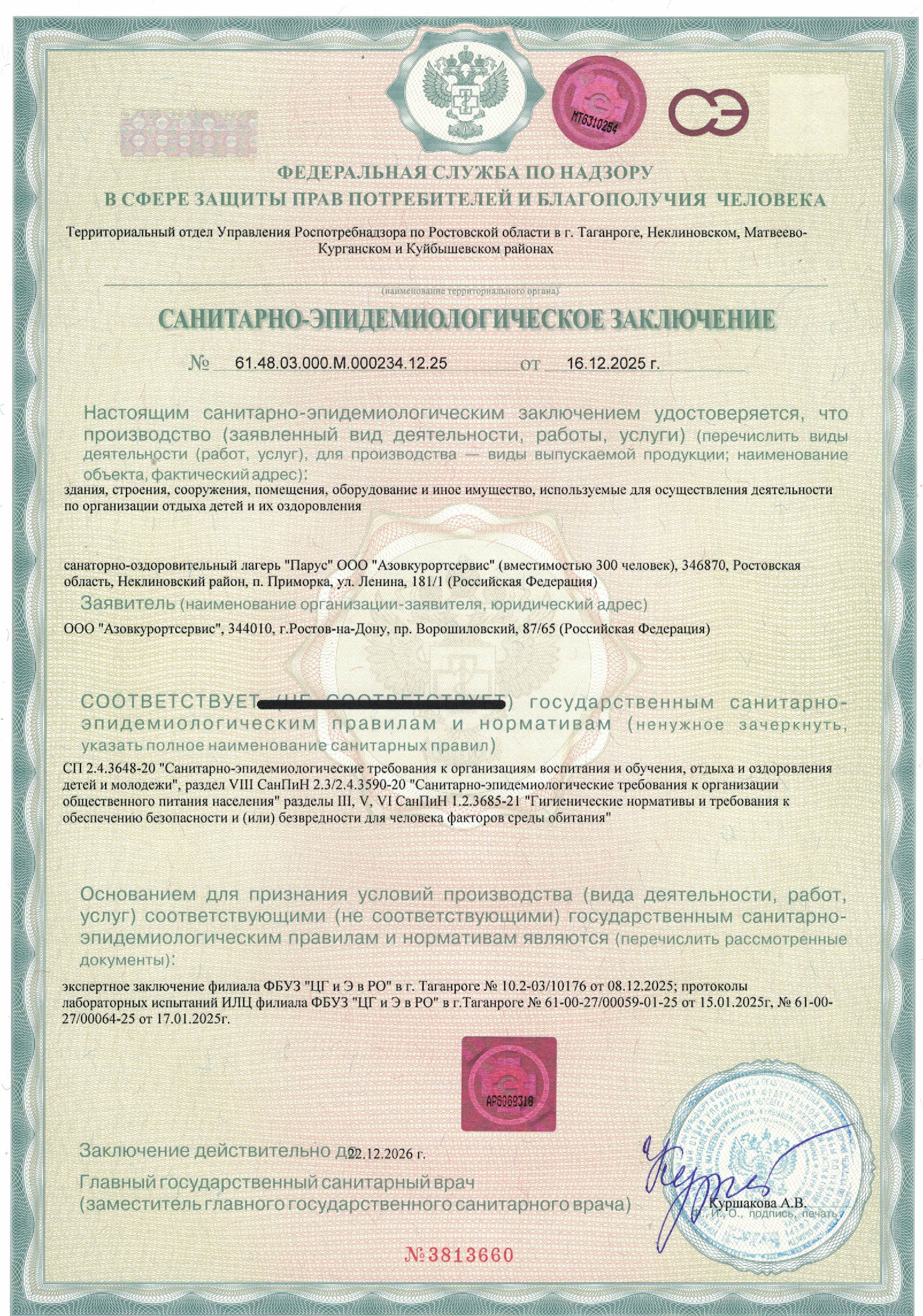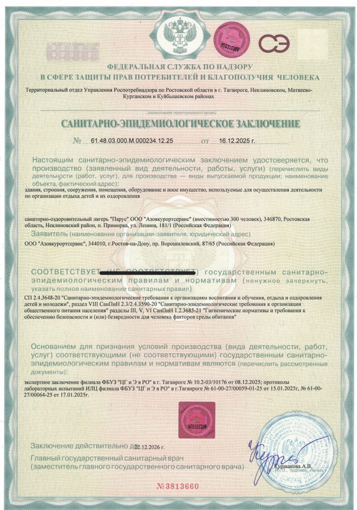 тел./факс: (863) 234-50-92, 239-95-65, e-mail: azovkurort-parus@mail.ru